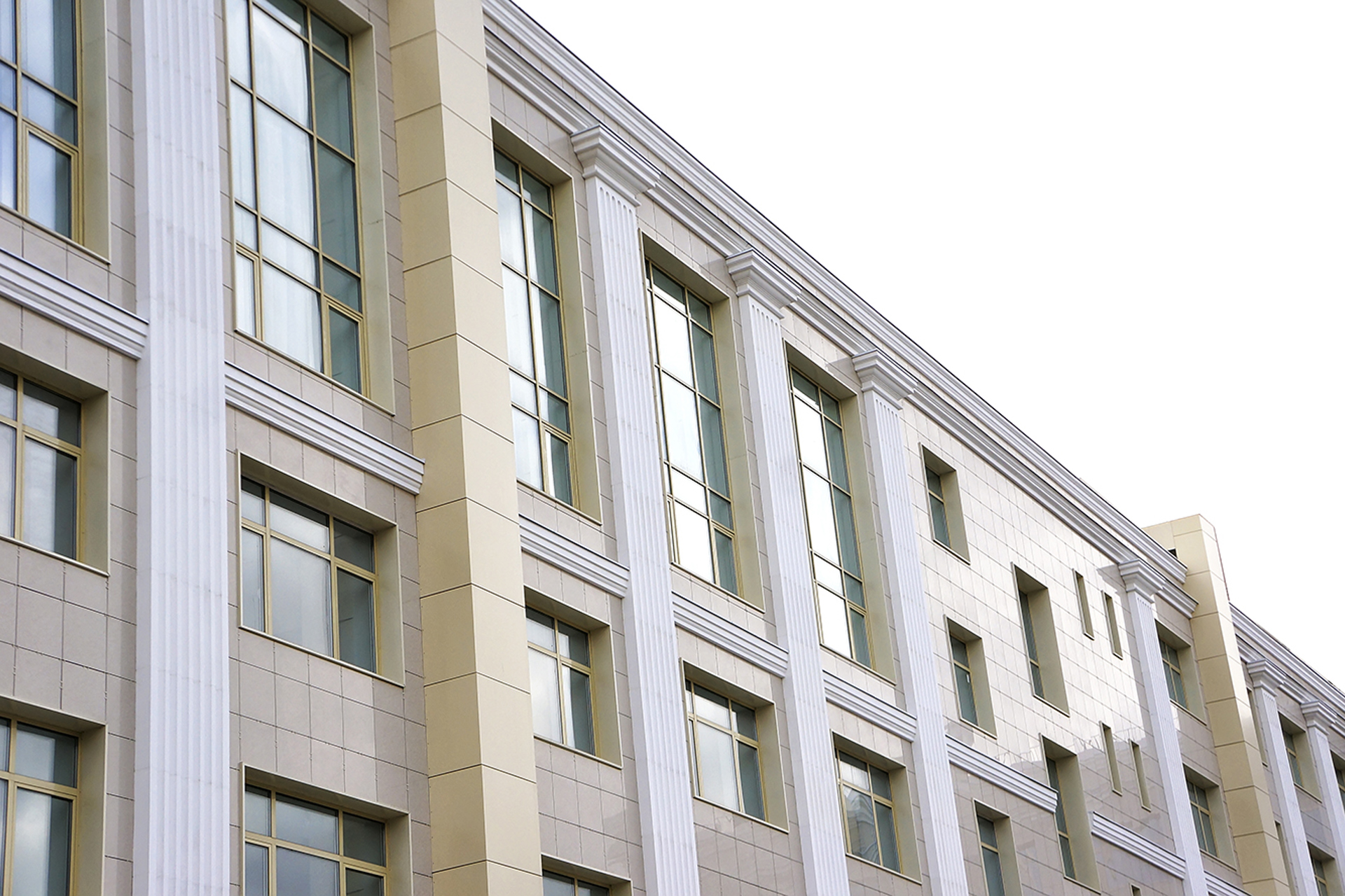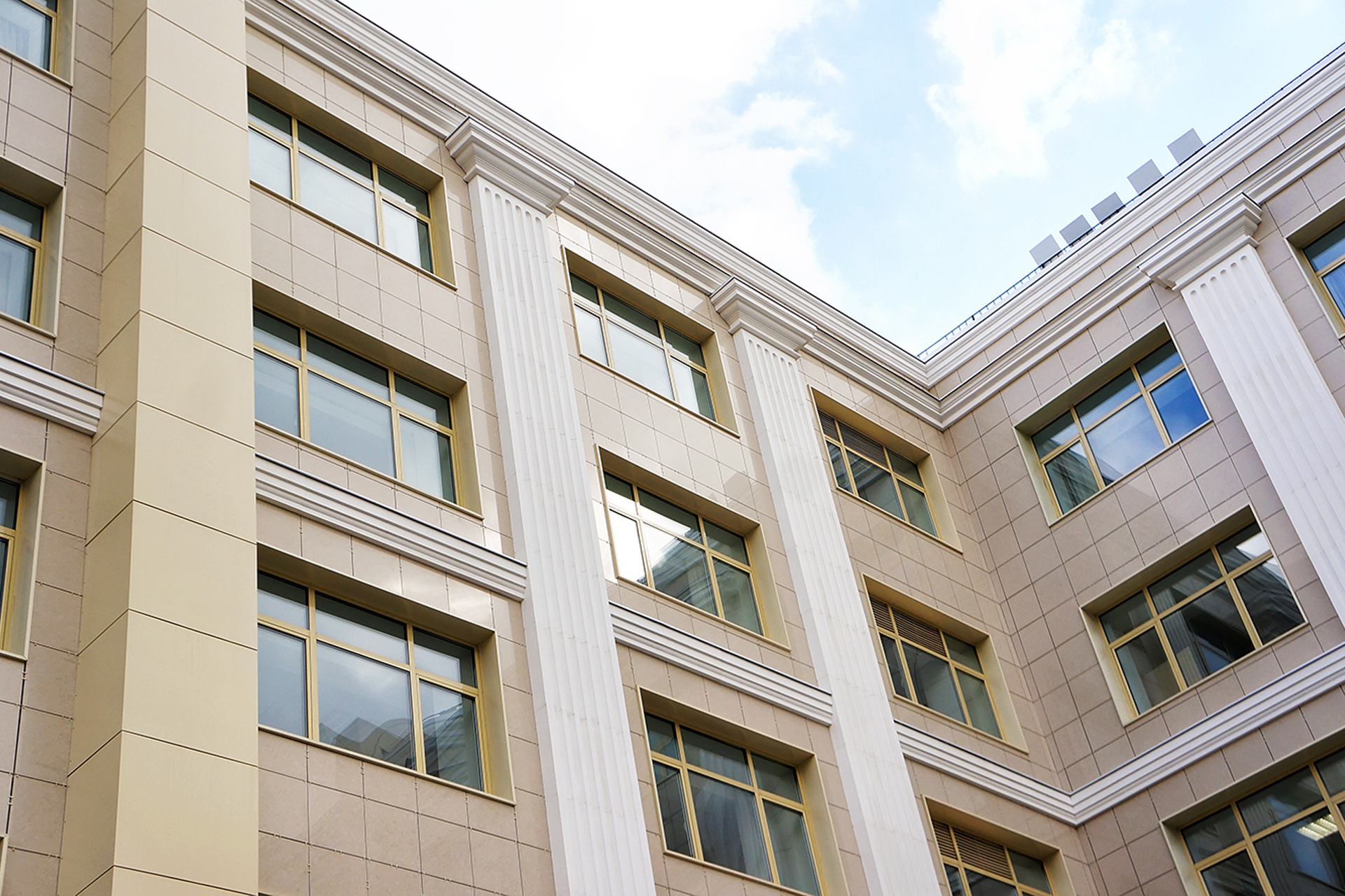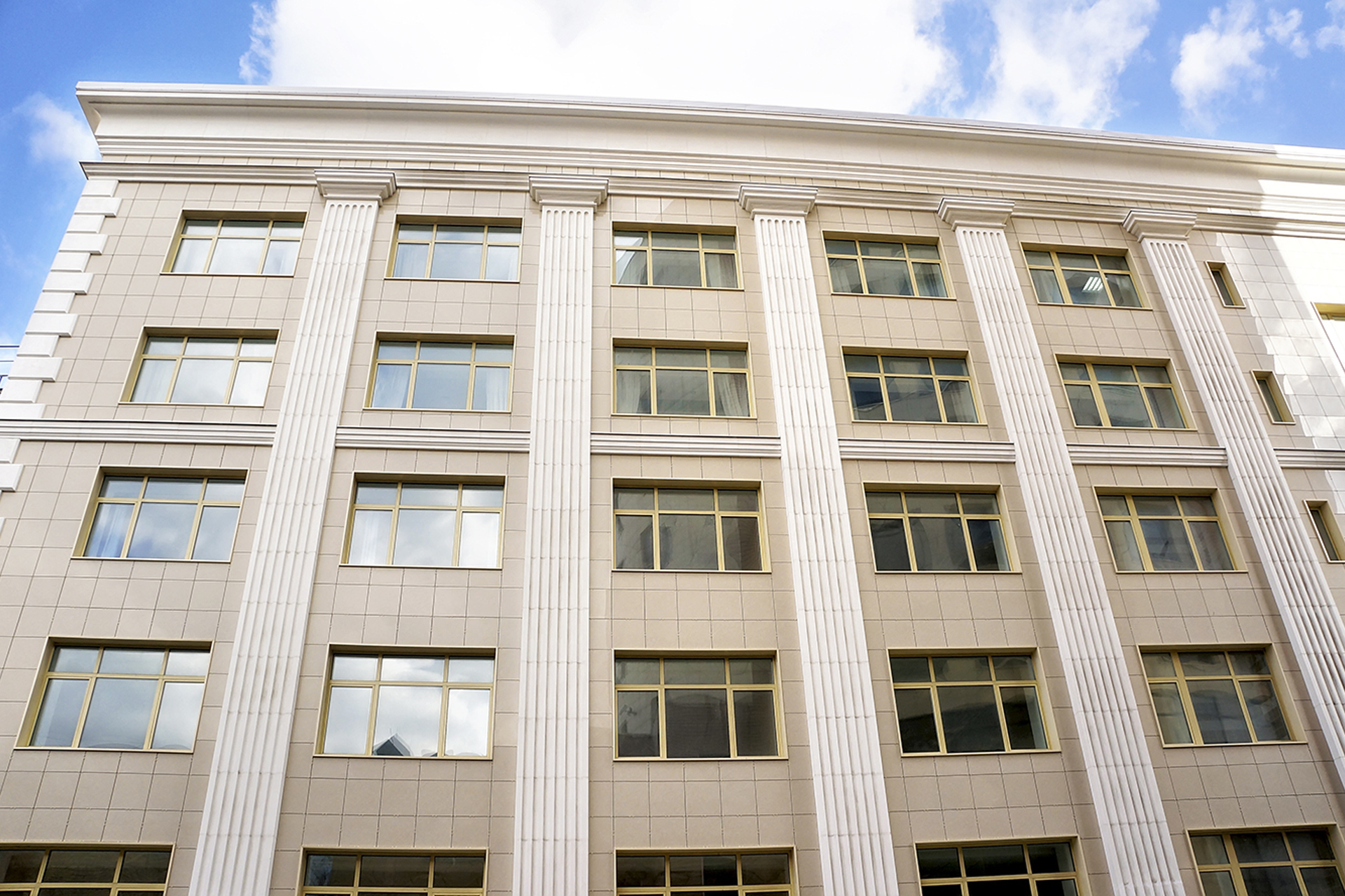 Облицовочный материал: керамогранит (видимое крепление), декор из стеклофибробетона